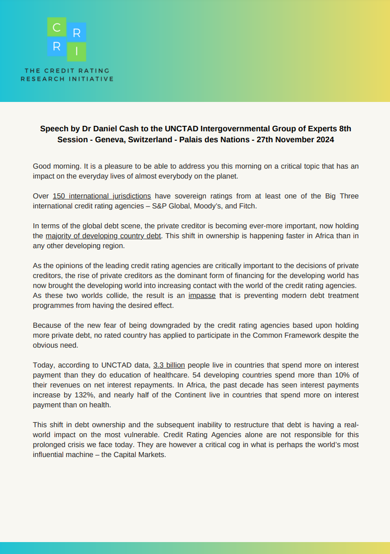 Presented to Ambassadors and Representatives from around the world at the Palais des Nations in Geneva, Switzerland. Focused on the intricacies of regulating credit rating agencies and potential effects and implications. Repeated calls for a greater focus on building capacity within the Global South for the field of credit ratings.